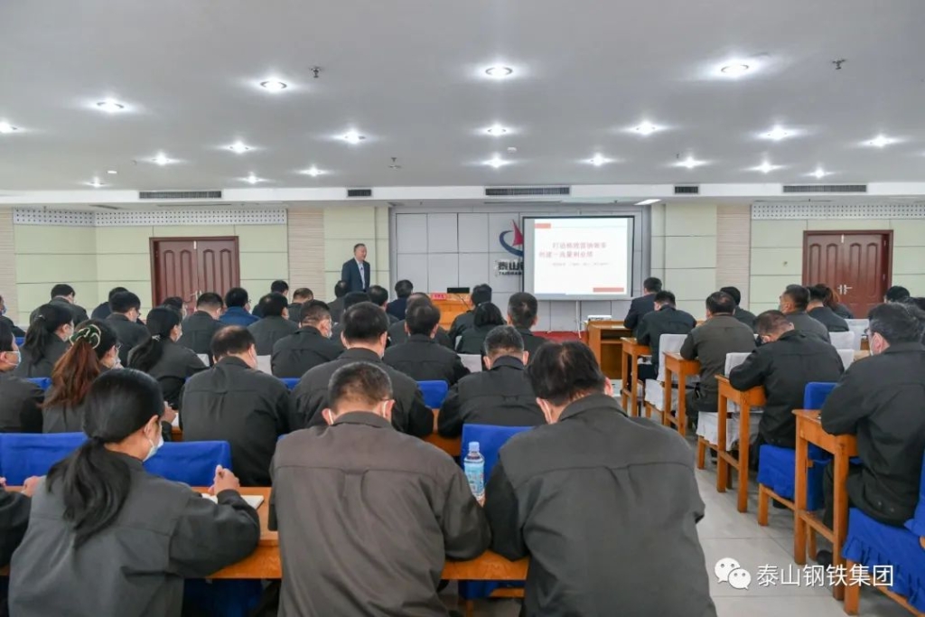 10月16日,泰山钢铁集团中高层干部营销管理研修在经贸楼会议室举行,集团党委书记、董事长、总裁王永胜致开场词。集团党委成员、总监邵书东,总监郑红君、李海洋,总经理助理王晓林、魏述亮参加活动。