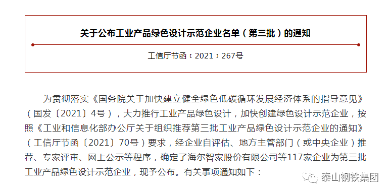 为贯彻落实《国务院关于加快建立健全绿色低碳循环发展经济体系的指导意见》(国发〔2021〕4号),大力推行工业产品绿色设计,加快创建绿色设计示范企业,工业和信息化部近日公布第三批工业产品绿色设计示范企业名单,泰山钢铁集团榜上有名。
