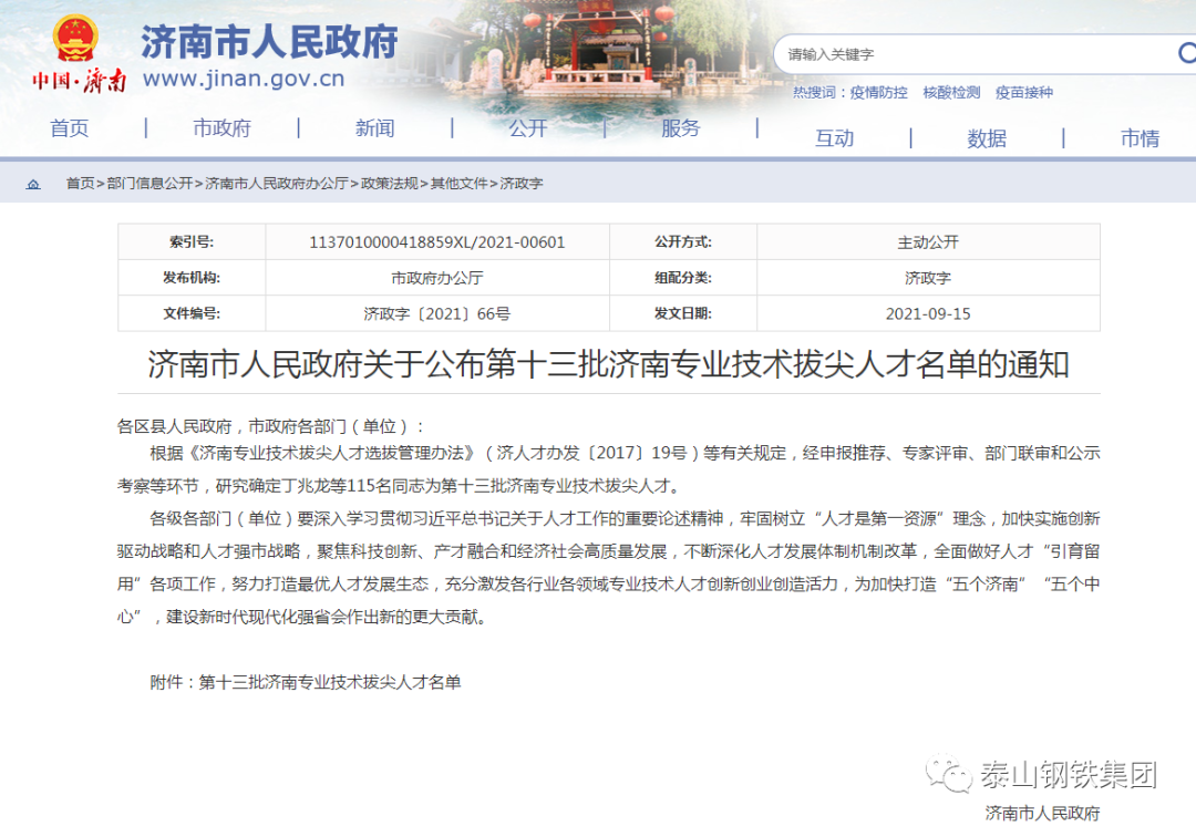 济南市人民政府公布第十三批济南专业技术拔尖人才名单,集团党委书记、董事长、总裁王永胜,职工亓萌光荣上榜。展望未来,泰山钢铁将继续发挥企业责任,坚定不移地走专业化、品牌化道路,在“高精专特”上做文章,在“产城融合”上下功夫,专心致志地炼好钢、炼优钢、炼好不锈钢,为建设制造业强国贡献更多“半岛(中国)一站式服务平台力量”!编辑:李文树
