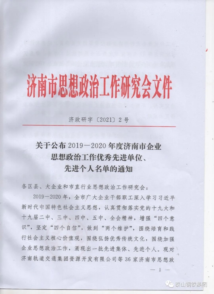 荣誉催人奋进,激励担当作为。连日来,泰山钢铁集团凭借高质量的产品、雄厚的技术、扎实的思想政治工作、卓越的科研团队,在产品研发、思想政治工作、人才培养等方面连续收获多项荣誉。