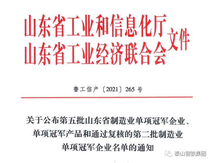 山东省工业和信息化厅、山东省工业经济联合会联合下发《关于公布第五批山东省制造业单项冠军产品和通过复核的第二批制造业单项冠军企业名单的通知》,集团“铬系不锈钢热轧钢带”光荣入选山东省制造业单项冠军产品。
