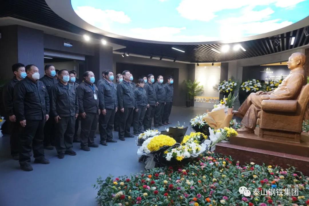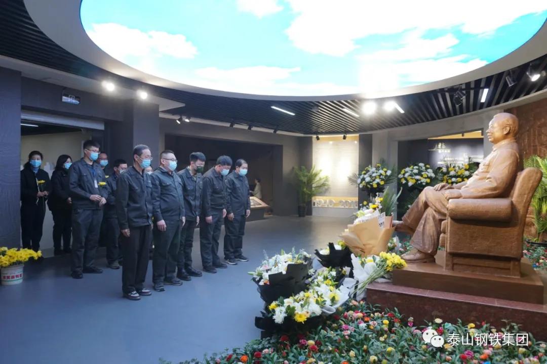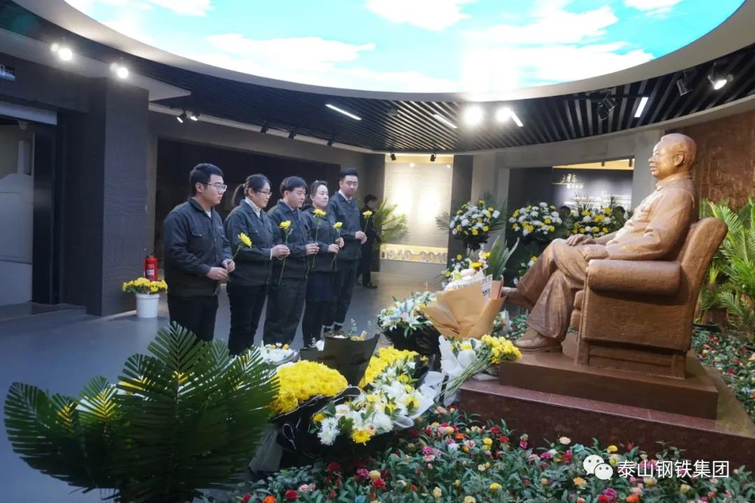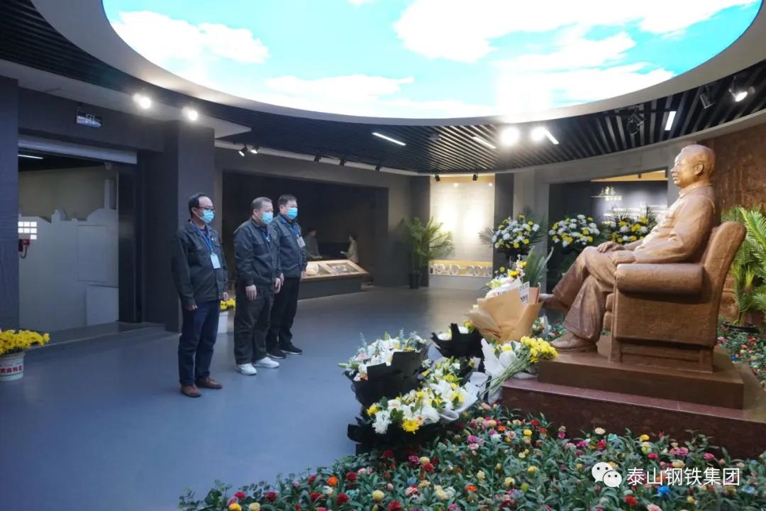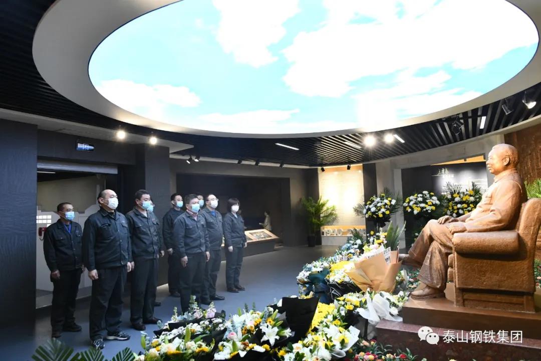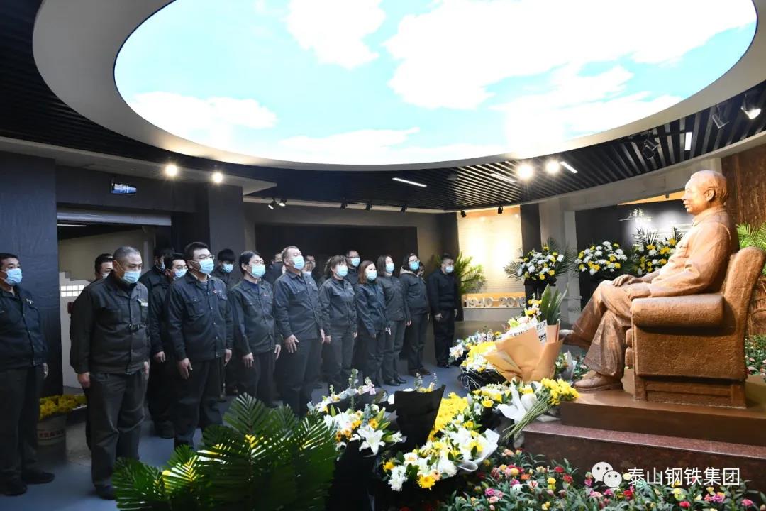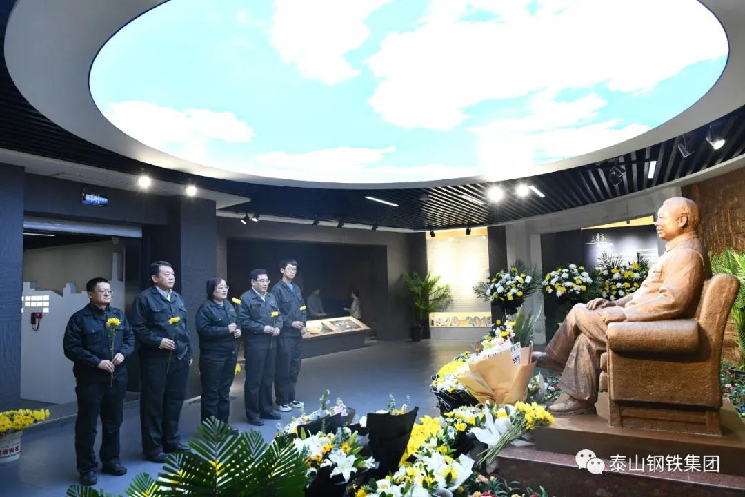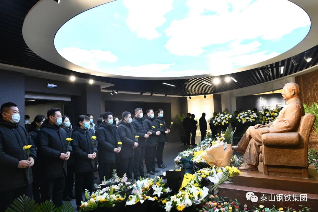 2022年1月1日上午9时,泰山钢铁集团党委书记、董事长、总裁王永胜带领在家公司领导一起拾级而上,缓步走进庄严肃穆的老书记纪念馆,向老书记雕像敬献鲜花。鲜艳挺拔的花烛、芬芳吐蕊的百合、轻盈绽放的文心兰,寄托着对已故老书记王守东同志的深切缅怀和崇高敬意。