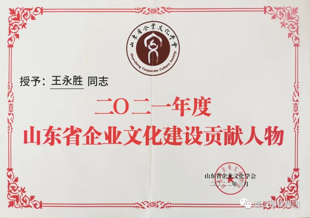 近日,山东省企业文化学会下发了《关于发布2021年度山东省企业文化建设典型名单的决定》文件,表彰了一批企业文化建设典型单位和个人。其中,泰山钢铁集团被授予“2021年度山东省企业党建文化典范单位”荣誉称号,集团党委书记、董事长王永胜获得“2021年度山东省企业文化建设贡献人物”荣誉称号。
