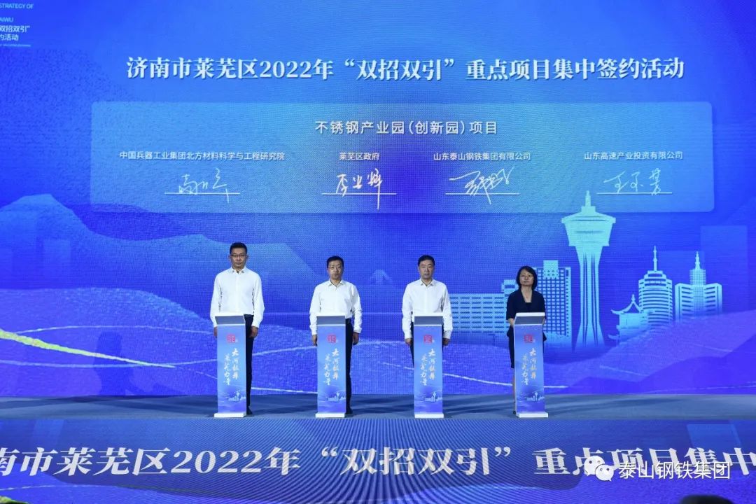 会上,莱芜区政府和来自地方重点企业、招商引资企业的代表们签署了23个投资合作项目。其中,集团党委成员、总经理邵书东上台签约不锈钢产业园(创新园)项目。