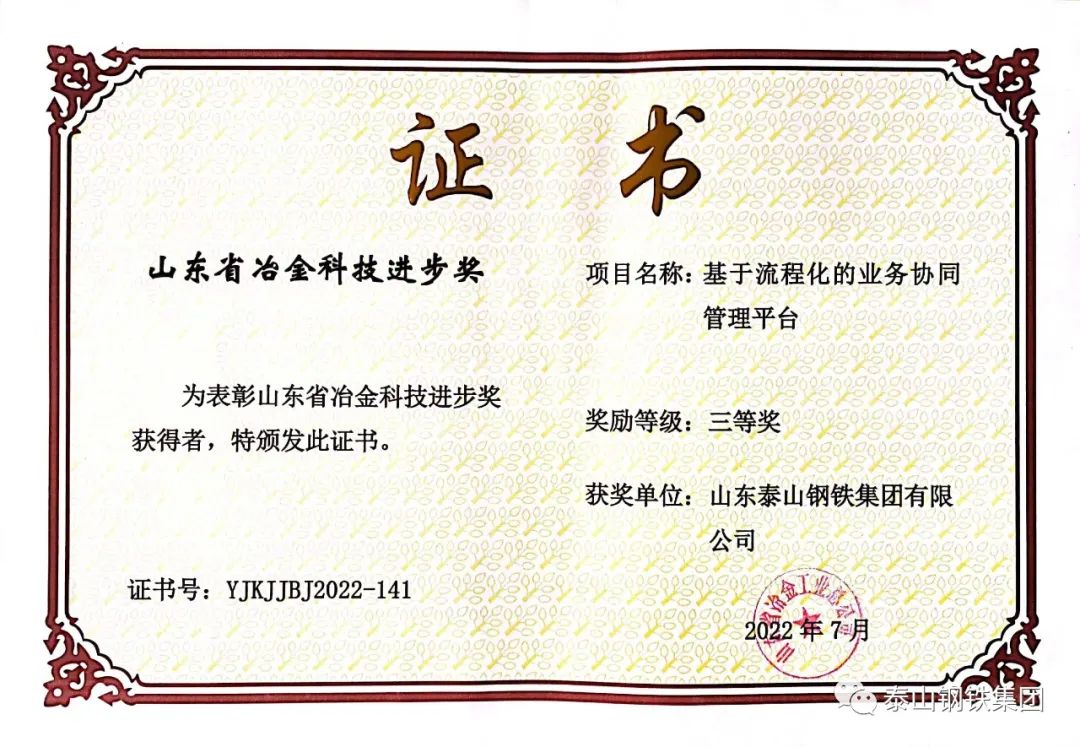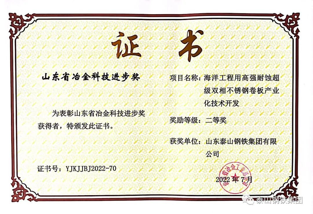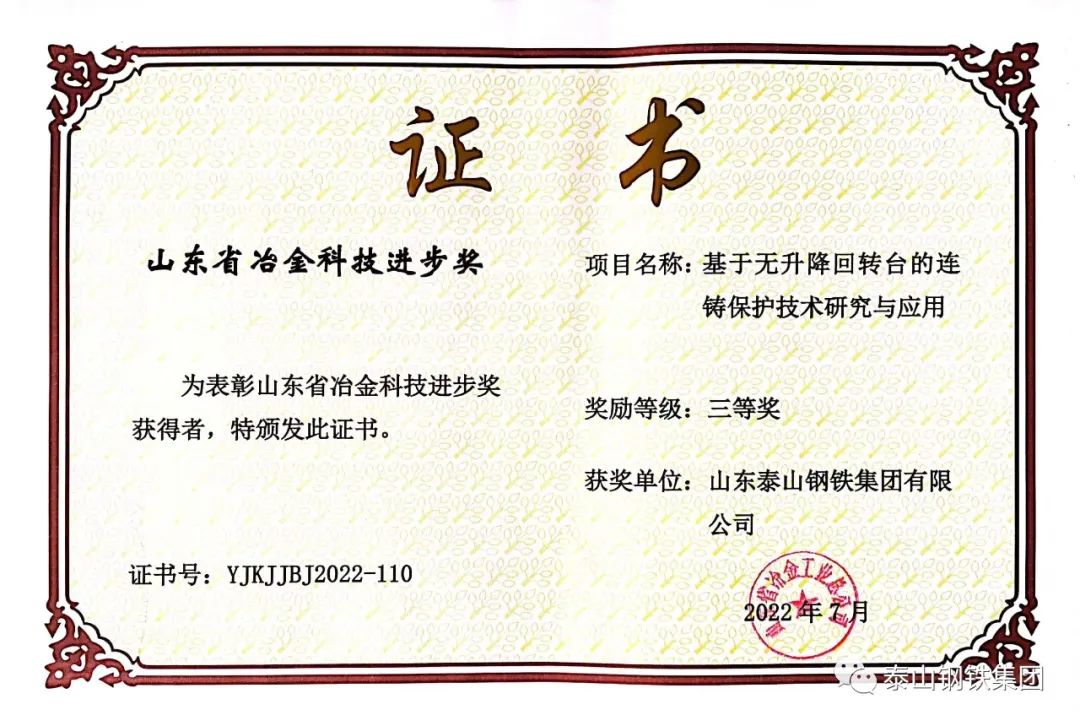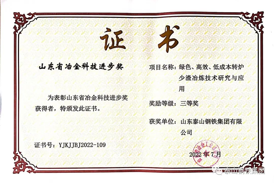 近日,山东省冶金工业总公司对荣获“2022年度山东省冶金科技进步奖”的单位颁发了获奖证书。泰山钢铁集团8个科技创新成果获奖,彰显了企业科技创新实力,为提升企业知名度,争取科技政策和科技平台支持,提供了有力支撑。