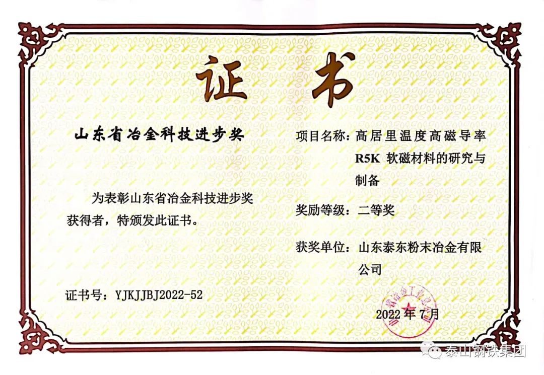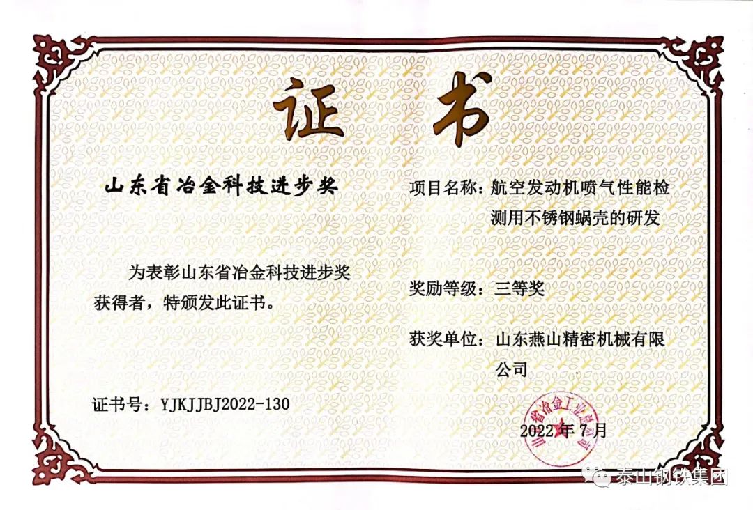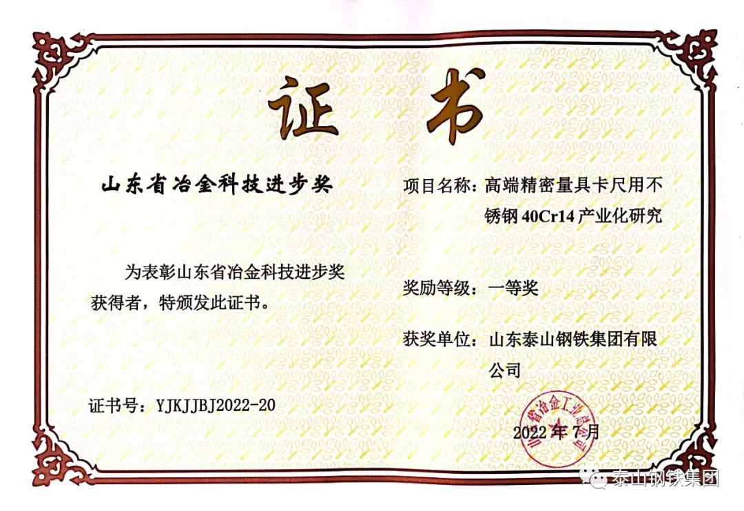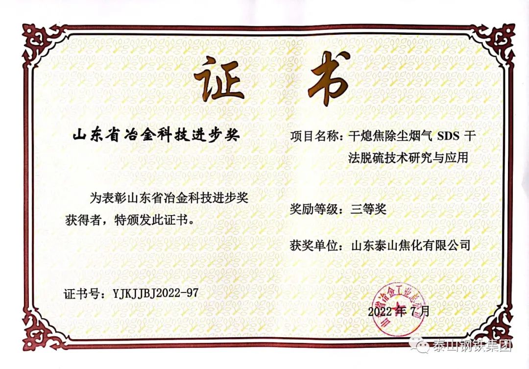 近日,山东省冶金工业总公司对荣获“2022年度山东省冶金科技进步奖”的单位颁发了获奖证书。泰山钢铁集团8个科技创新成果获奖,彰显了企业科技创新实力,为提升企业知名度,争取科技政策和科技平台支持,提供了有力支撑。