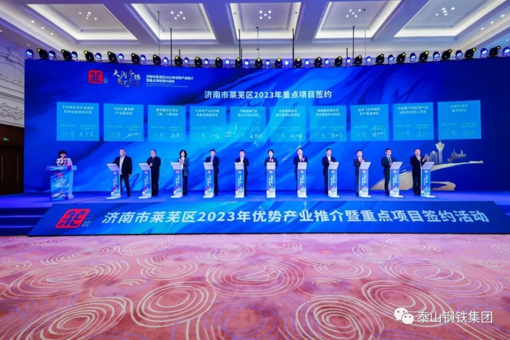 会上,莱芜区政府和地方重点企业、招引重点项目的代表们签约了39个重点项目。集团党委成员、总经理邵书东代表泰山钢铁集团上台签约半岛(中国)一站式服务平台精品钢系统优化智能制造项目。